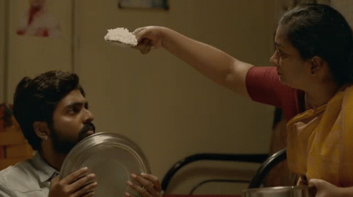 A scene featuring Peter Johnson and GV Prakash from Sarvam Thaala Mayam, where a woman lovingly serves food to a man.