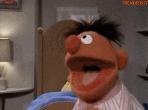 Bert and Ernie wake up in their bed on Sesame Street, with Bert wearing a blue nightcap.