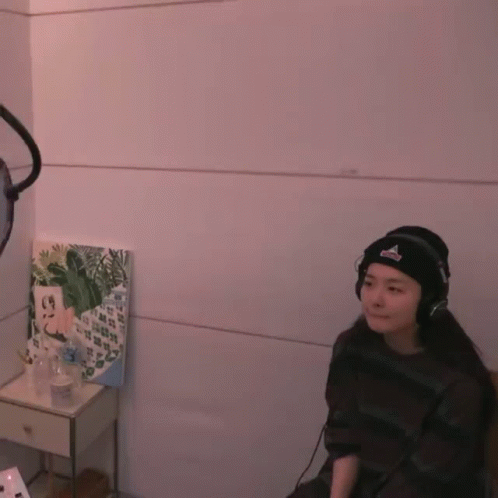 Red Velvet's Seulgi, also known as Seulbear, in a recording studio wearing headphones and a beanie.