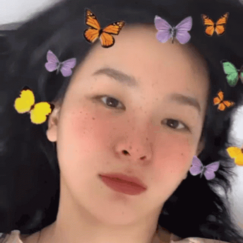 K-pop idol Seulgi (Kang Seulgi) from Red Velvet, with a playful butterfly filter and freckles, looking at the camera.