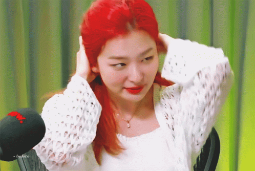 Seulgi Kang Seulgi adjusting her vibrant red hair, looking directly at the camera.