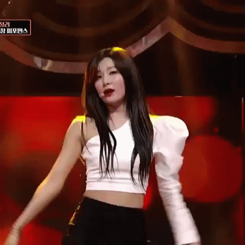 K-pop idol Kang Seulgi of Red Velvet makes an adorable heart gesture on stage, showing her love.