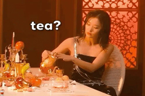 Seulgi from Red Velvet elegantly pours tea at a lavishly decorated table, asking "tea?".