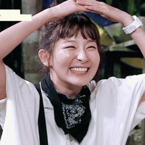 Seulgi from Seulisasoo smiles shyly with hands on her head, wearing a white shirt and bandana.