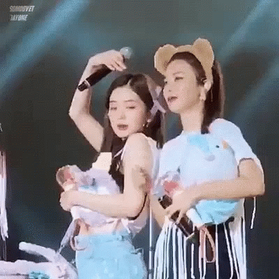 Seulgi and Irene make a heart gesture together on stage, holding microphones and plush toys.