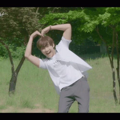 Seunghyun Songsari smiles brightly, making a heart shape with his hands outdoors in a field.