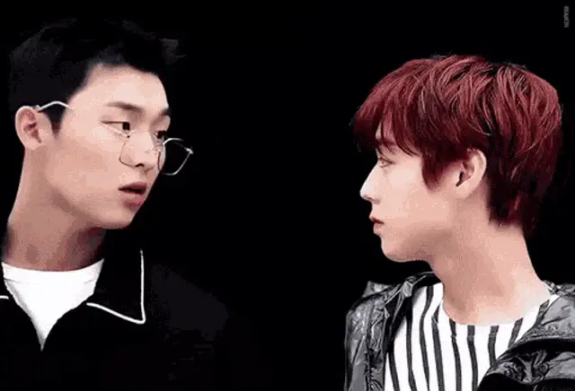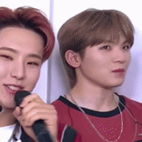 Seventeen's Woozi and Hoshi share a confused reaction during an event, with Woozi holding a microphone.