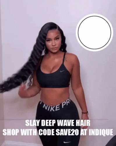 Stunning woman showcasing long, voluminous deep wave hair extensions, promoting Indique Hair with code SAVE20.