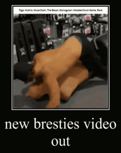 A person performs push-ups on another's back, humorously announcing a 'new bresties video out'.