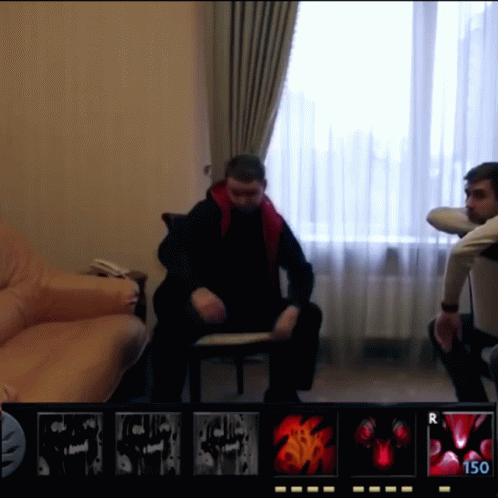 A man in a red vest mimics Shadow Fiend's movements from Dota 2, with game UI overlaid at the bottom.