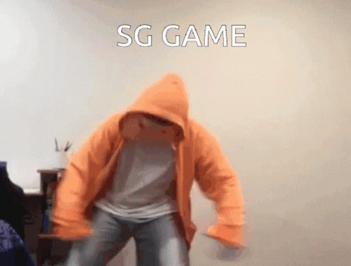 A person in an orange hoodie and silver pants dances energetically in front of a wall displaying 'SG GAME'.