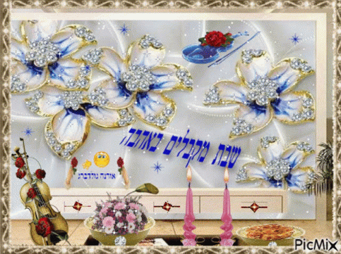 A beautiful greeting for Shabbat featuring flowers, violins, candles, and text by Orna Goldberg.