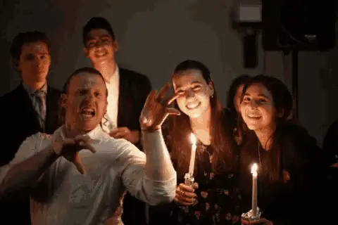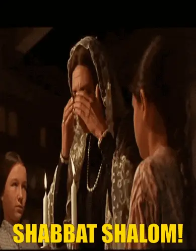 A green frog puppet with rapidly changing colors displays the Hebrew/Yiddish phrase 'Good Shabbos'.