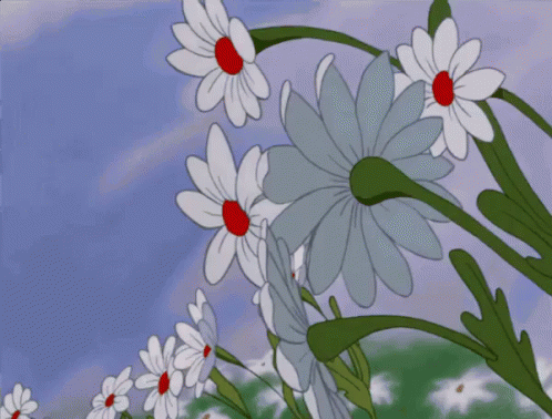 Alice from Wonderland lies among white daisies with red centers, looking up, with the Hindi greeting 'Good morning'.