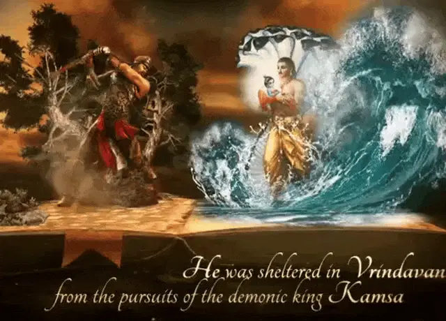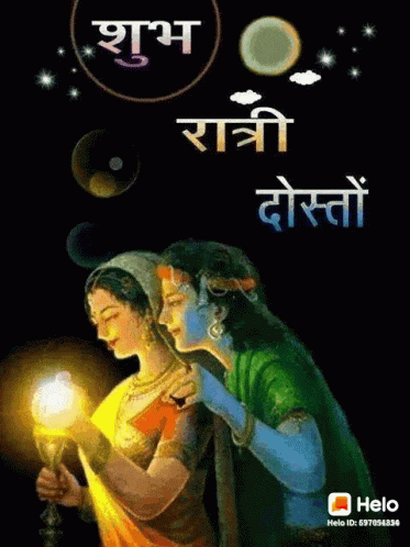 A beautiful painting of Radha and Krishna, with Krishna holding a traditional lamp, conveying a serene good night message.