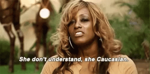 A woman delivers a memorable line, stating "She don't understand, she Caucasian," in a candid moment.