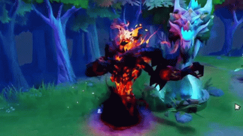 Shadow Fiend performs a dance in Dota 2, showcasing its fiery form in a forest setting.