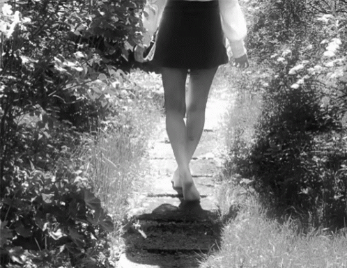 A person walks barefoot on a sun-dappled path, casting long shadows in a black and white scene.