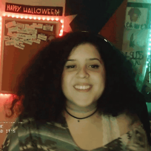 Shagarita Shalymar smiles brightly, with the word 'HERE' overlaid, in front of a 'Happy Halloween' sign.