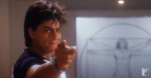 Shah Rukh Khan points directly at the camera with a smirk, from the iconic movie Dil To Pagal Hai.