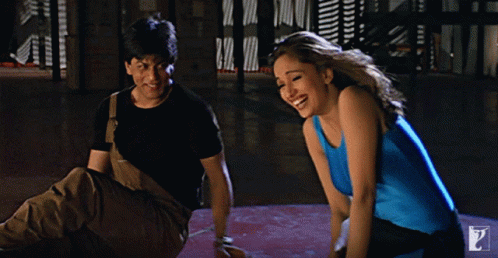 Shah Rukh Khan and Madhuri Dixit sharing a joyful moment, laughing heartily together.
