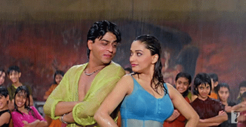 Shah Rukh Khan and Madhuri Dixit share a joyful moment dancing in the rain, smiling at each other.