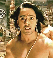 Shaheer Sheikh as Arjun from Mahabharat, with a shocked and intense expression, in an ornate setting.