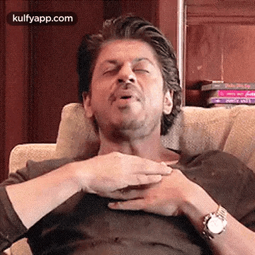 Shah Rukh Khan sits on a couch, hands on his chest, eyes closed, showing an emotional reaction.