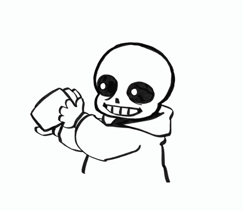 Sans from Undertale adorably shaking a mug with funny, rotating eyes.