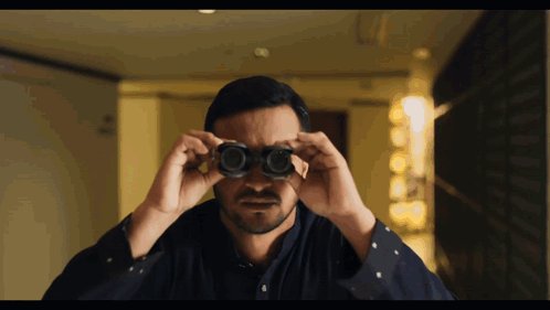 Shakib Al Hasan intently searches with binoculars, peeking around corners and through foliage.