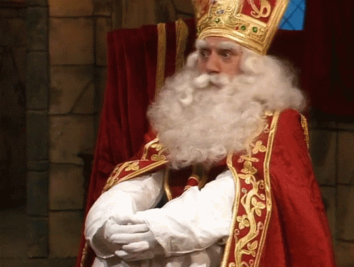 St Nicholas, also known as Sinterklaas, shakes his head in denial, wearing his traditional red robe and golden miter.