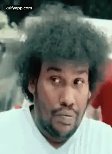 Tamil actor and comedian Yogi Babu makes a funny face while shaking his head, a classic comedic reaction.