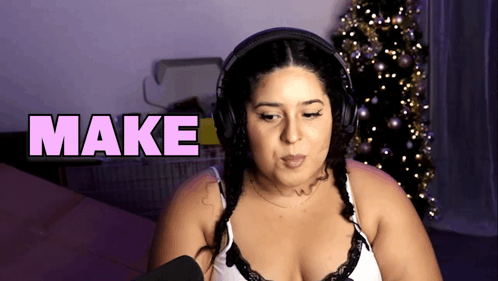 Shalymar Shagarita, the gamer and streamer, wearing headphones and a bra in front of a Christmas tree.