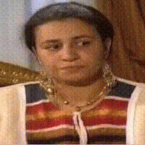 Egyptian actress Abla Kamel shows an expressive "shame on you" reaction, gesturing with her hands.