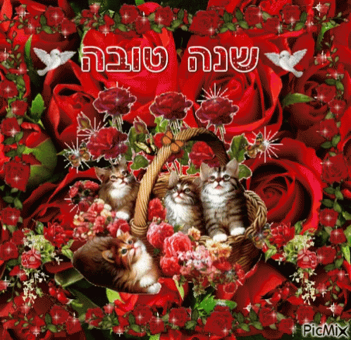 A festive Shana Tova greeting featuring adorable kittens in a basket surrounded by vibrant red roses, wishing a Happy New Year.