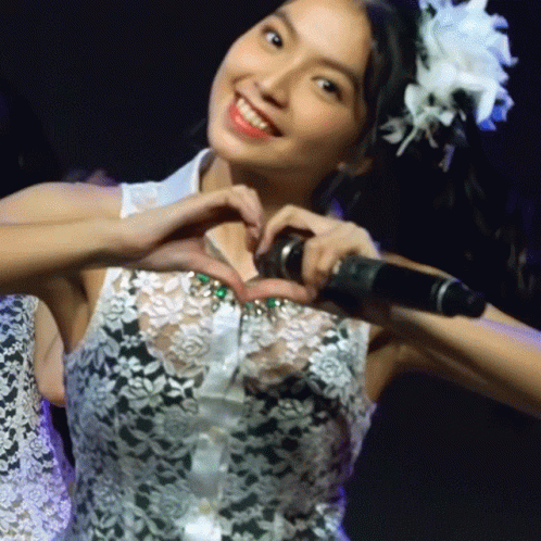 Shania Gracia of JKT48 making a heart shape with her hands during a stage performance.