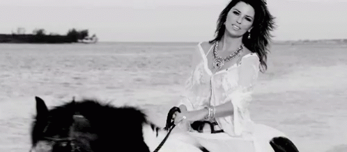 Shania Twain gracefully rides a horse on a serene beach, looking directly at the camera and smiling.