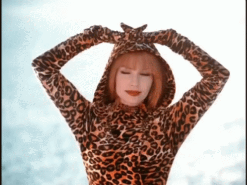 Shania Twain strikes a sassy pose in a leopard print hooded top, hands on her head.