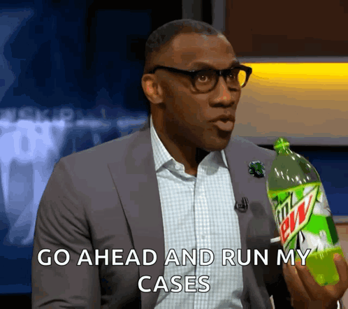 Shannon Sharpe takes a big swig from a large bottle of Mountain Dew, with the caption 'GO AHEAD AND RUN MY CASES'.