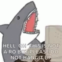 A cartoon shark diligently typing on a computer keyboard, accompanied by a robot.