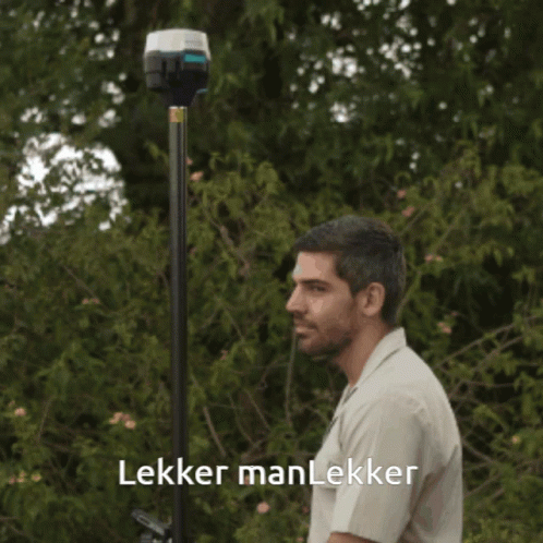 A man smiles and gives a thumbs-up next to surveying equipment, with the phrase 'Lekker man' displayed.
