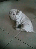 A cute Shar Pei puppy playfully interacts with a person's hand and foot, licking and nibbling.