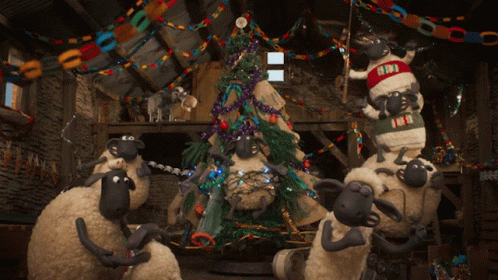 Shaun the Sheep and his flock enthusiastically decorate a festive Christmas tree in the barn.