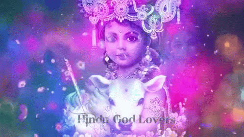 Vibrant painting of baby Krishna, also known as Shyam Ji, with 'Hindu God Lovers' text.