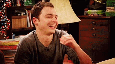 Sheldon Cooper from The Big Bang Theory laughing heartily, covering his mouth with his hand.