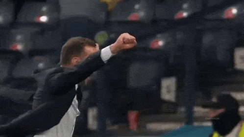 Andriy Shevchenko, also known as Sheva, celebrates enthusiastically, raising his fists in the air during a match.