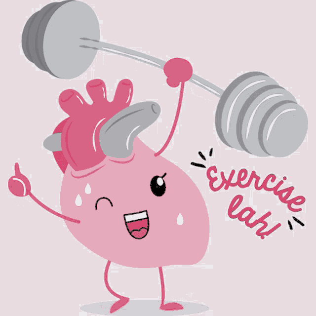 A cartoon heart lifts dumbbells, encouraging exercise with 'exercise lah!' from Singapore Heart Foundation.