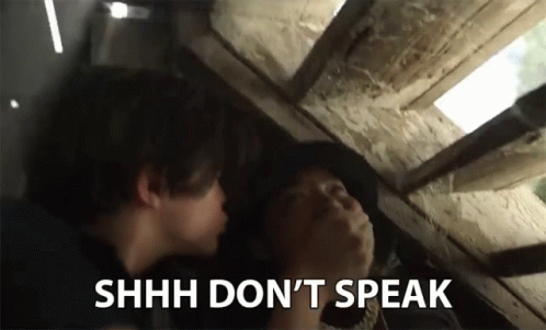 Gabriel (Benjamin Flores Jr) silences Dariush (Alessio Scalzotto) by covering his mouth, with the caption 'Shhh Don't Speak'.