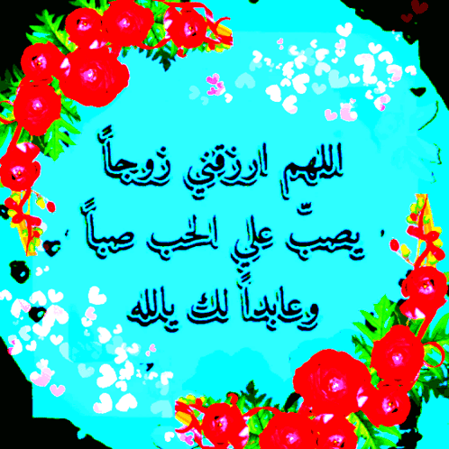 A beautiful Islamic prayer for a righteous spouse, set against a vibrant blue background with red flowers and hearts.