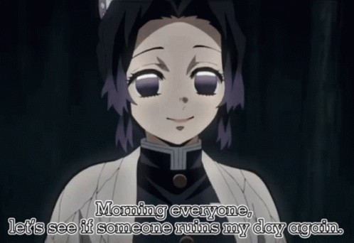 Shinobu Kocho from Demon Slayer gives a sarcastic morning greeting, wondering if someone will ruin her day.